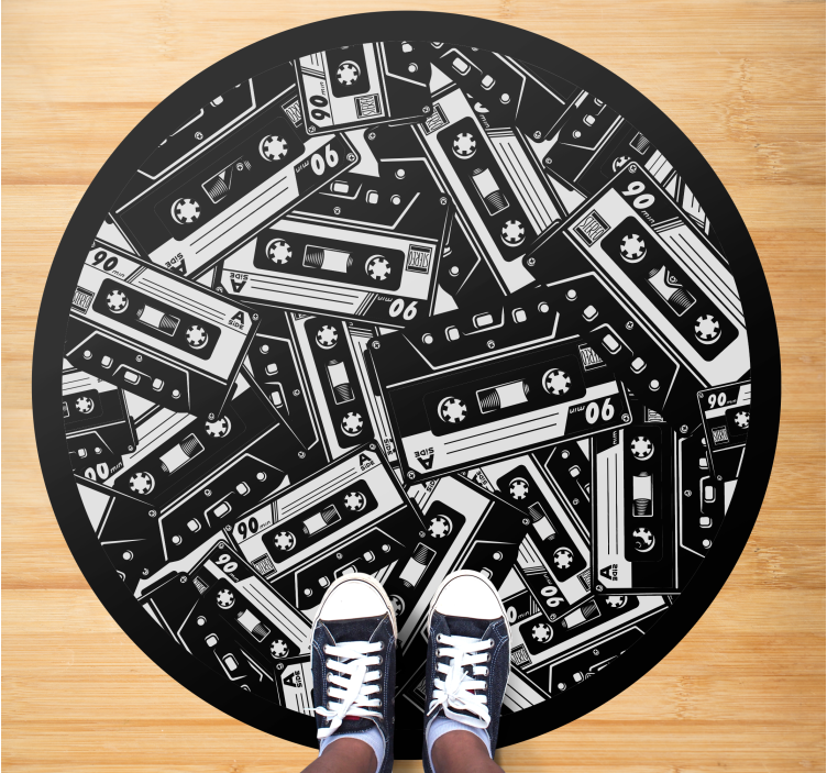 Referință: R19711O aranjare creativă a casetelor audio umple suprafața circulară, având o paletă monochromatică de alb și negru. Designul evidențiază diverse unghiuri și poziții ale casetelor, oferind un omagiu nostalgic istoriei muzicii și esteticii retro.