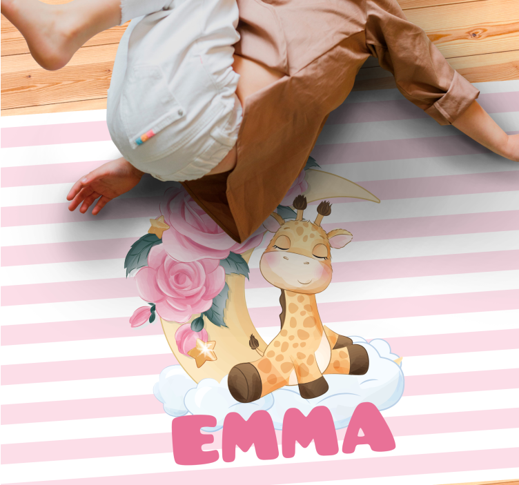 Descoperiți magia unui spațiu personalizat cu Covor de vinil pepiniere girafă fericită personalizată! Designul grafic al acestui covor este cu adevărat încântător, având o girafă drăguță înconjurată de flori și nori roz, ce aduce un strop de veselie și originalitate în orice cameră. Poate fi personalizat cu numele dorit, transformându-l într-un element de decor unic pentru micuțul dumneavoastră.