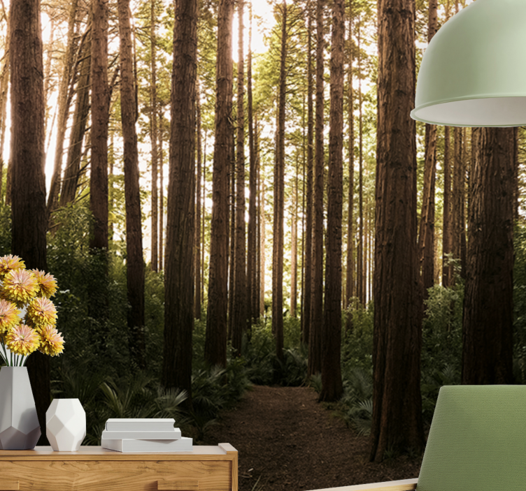 Descoperiți frumusețea naturii cu Fototapet natura copaci înalți din pădure, un design grafic care evocă imaginea unei păduri tropicale pline de verdeață, cu trunchiuri impunătoare și o cărare ce te invită să te pierzi în mijlocul naturii. Fiecare detaliu al acestei fotografii surprinde esența pădurii, transformându-vă zidurile într-un refugiu natural.