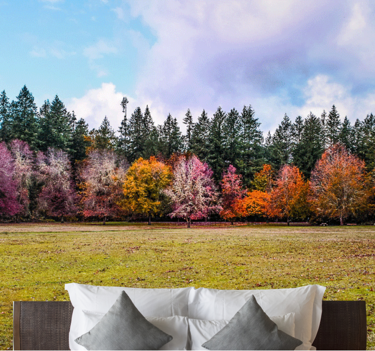 Descoperiți frumusețea naturii cu Fototapet natura pădurea colorată de toamnă, un design grafic captivant care îmbină copaci, pădure, câmp, peisaj și o fotografie vibrantă ce evocă atmosfera de toamnă. Culorile calde și nuanțele bogate ale acestui fototapet transformă orice spațiu într-un refugiu natural, aducând magia sezonului în interiorul casei dumneavoastră!