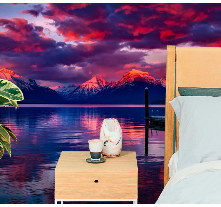 Referință: F11975O priveliște uimitoare a munților înalți se reflectă într-un lac liniștit la apus, evidențiind culori vibrante în cer. Suprafața liniștită a apei creează un efect de oglindă, subliniind măreția peisajului. Un ponton se extinde în scenă, invitând la contemplarea frumuseții naturii.