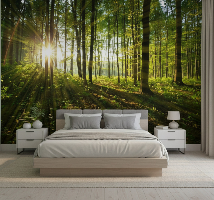 Referință: F11921Transformă-ți spațiul cu un strop de natură adus de Păduri fototapet păduri cu raze de soare aurii, un design grafic inspirat care îmbină nuanțele calde ale soarelui cu frumusețea pădurii. Acest fototapet, realizat în culori mate și din material nețesut, emană o atmosferă de liniște și fericire, oferind un refugiu vizual în orice cameră.