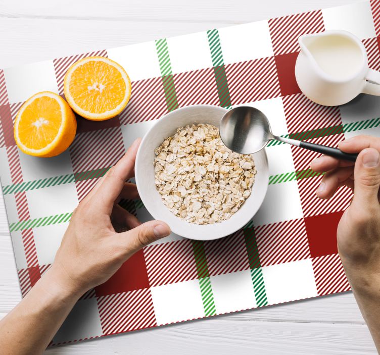 Referință: M3664Un model festiv de carouri prezintă dungi vibrante de roșu și verde aranjate într-un design tradițional în carouri, perfect pentru întâlniri de sărbătoare. Aranjamentul simetric îmbunătățește orice setare a mesei, creând o atmosferă veselă pentru sărbătorile de Crăciun.