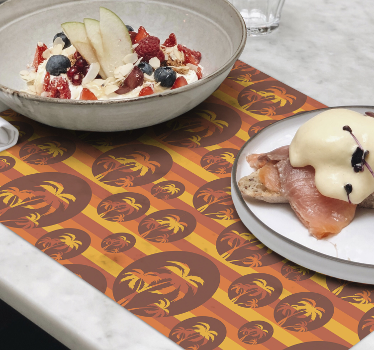 Referință: M3449Prezintă o compoziție vibrantă de modele de palmieri tropicali aranjați în cercuri și dungi. Paleta de culori calde accentuează atmosfera de vară, făcându-l o alegere perfectă pentru ocazii informale de dining.