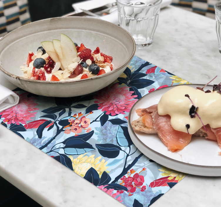 Referință: M3699Un model floral captivant, cu flori bogate în nuanțe de roz și galben, împletite cu frunze verzi închise. Acest design evocă o senzație de prospețime și vivacitate, perfect pentru a îmbunătăți experiențele de dining. Detaliile sale intricate adaugă eleganță și atrag atenția asupra oricărei mese.