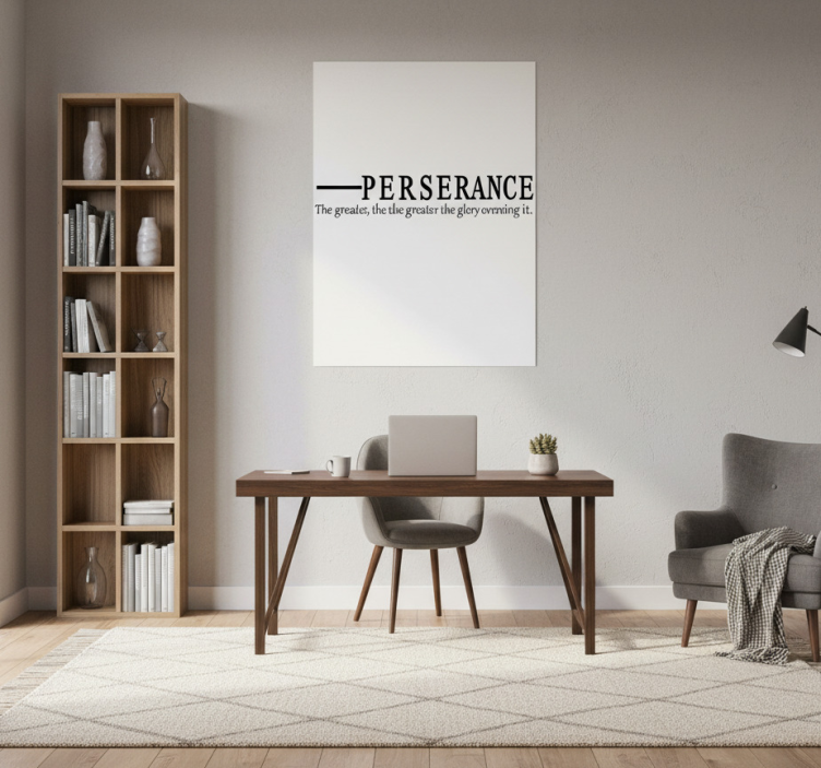 Acest spațiu de lucru modern dispune de un birou din lemn elegant, asociat cu un scaun confortabil. O poliță minimalistă expune obiecte decorative alături de cărți. Un citat inspirațional despre perseverență împodobește peretele, încurajând motivația. Iluminarea blândă îmbunătățește atmosfera confortabilă, în timp ce un covor texturat adaugă căldură acestui mediu primitor.