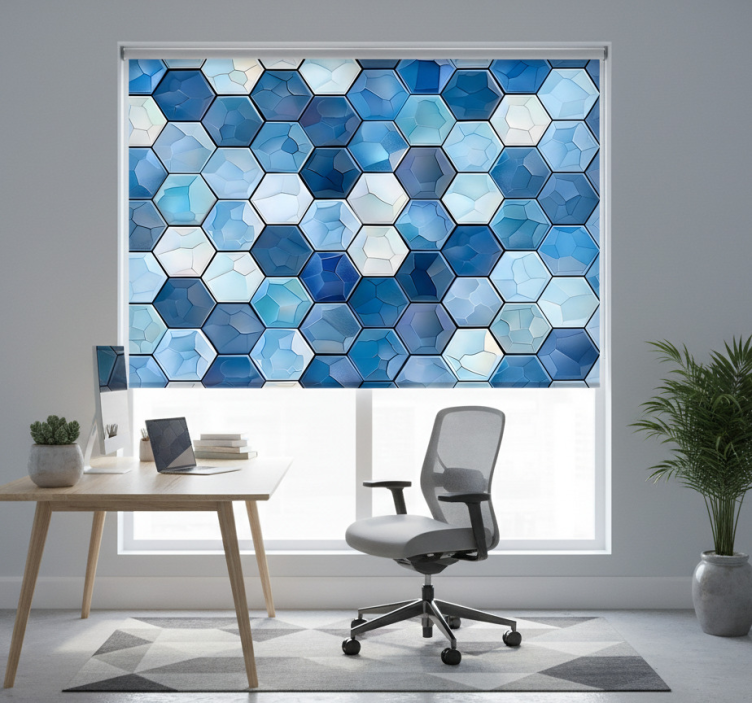 Referință: E7373Descoperiți Rulou geam birou efect plăci albastre, un produs cu un design grafic modern ce îmbină eleganța cu funcționalitatea, având o paletă de culori calde și un model inspirat din plăci albastre, perfect pentru a transforma orice birou într-un spațiu de lucru plăcut și inspirator.