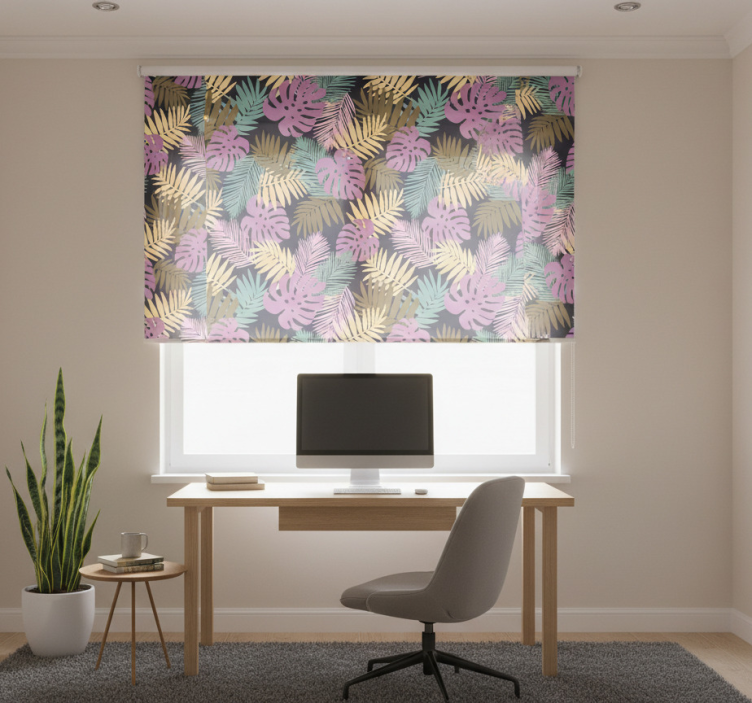 Rulou geam birou frunze verzi și roz tropicale este ideal pentru decorarea biroului deoarece aduce natura mai aproape de spațiul de lucru, stimulând creativitatea și reducând stresul. Un decor inspirat din natură nu doar că îmbunătățește aspectul estetic al încăperii, dar contribuie și la o stare de bine generală, creând un mediu propice pentru concentrare și productivitate.