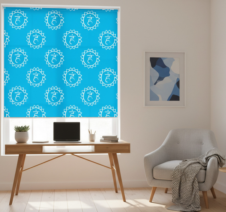 Referință: E7344Descoperiți eleganța și inspirația oferită de Rulou geam birou simbol chakra gâtului, un produs ce aduce un strop de liniște în orice spațiu. Designul grafic este o îmbinare perfectă de culori calde și simboluri reprezentative, transformându-l într-un element de decor ce nu doar că atrage privirile, dar și îmbunătățește atmosfera din încăpere.
