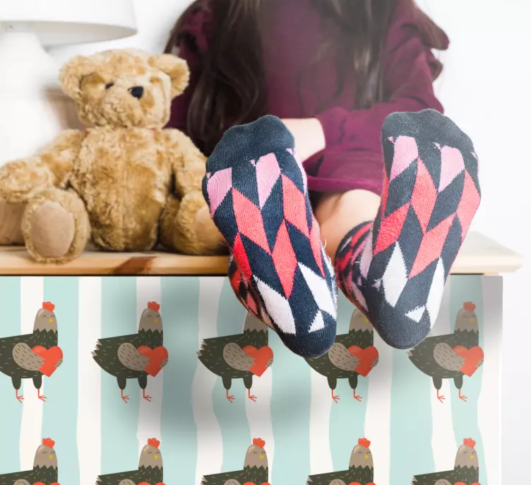Designul grafic al Autocolant animale model cu pui fermecători este cu adevărat încântător, aducând în prim-plan un cocoș vesel, cocoși jucăuși, inimi pline de dragoste și dungi colorate care transformă orice mobilă într-un element de decor fermecător inspirat de viața de fermă și animalelor drăguțe, făcându-l ideal pentru a adăuga un strop de bucurie în orice spațiu.
