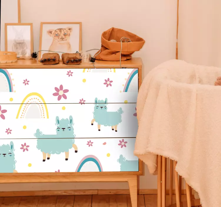 Descoperiți magia colorată a autocolantului concept llama fermecătoare, un design grafic captivant ce îmbină lame jucăușe, flori delicate și curcubee strălucitoare. Acest model desenat cu atenție va aduce un strop de veselie și culoare în orice spațiu, transformându-l într-un loc plin de viață și creativitate.
