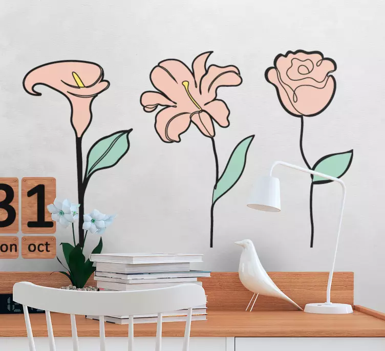 Descoperiți Autocolantul cu flori compoziție de flori grațioase, un produs cu un design grafic elegant ce înfățișează flori delicate, un desen inspirat din natură, cu culori pastelate ce aduc un aer decorativ rafinat oricărui spațiu. Acest autocolant transformă pereții într-o adevărată operă de artă botanică!