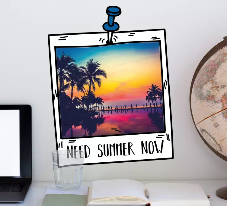 Descoperiți magia verii cu Autocolant cu natură cadru peisaj de vară, un design grafic captivant care surprinde esența unei zile perfecte pe plajă, cu un apus de soare vibrant și palmieri jucându-se în briza caldă. Acest autocolant evocă o atmosferă de vacanță, oferind vibrații de vară care transformă orice spațiu într-un colț de paradis.