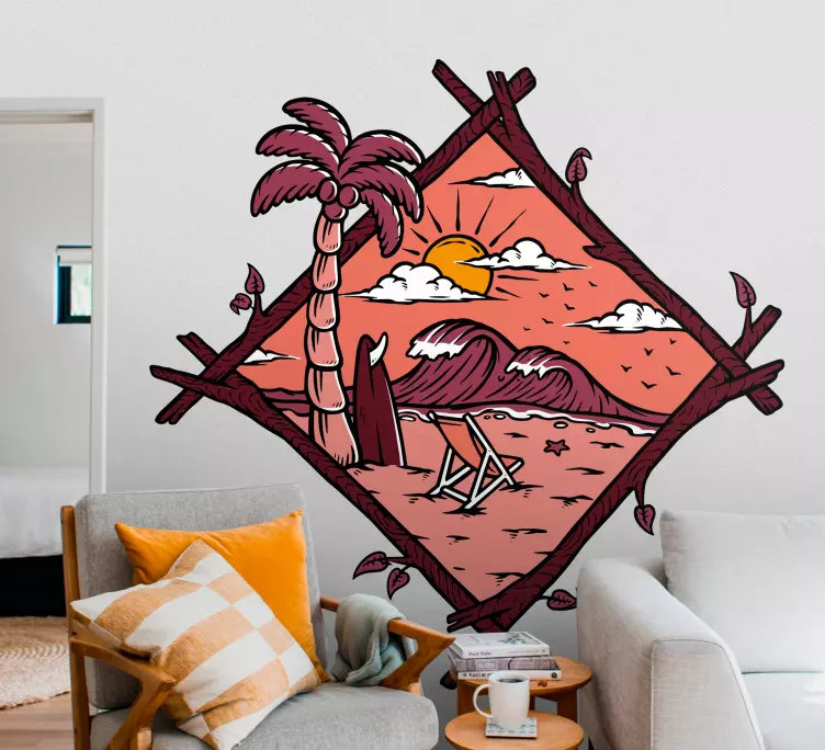 Descoperiți Autocolantul cu natură peisaj de plajă tropicală, un produs care îmbină perfect elemente vizuale precum un surfer solitar pe o plajă exotică, înconjurat de valuri blânde, palmieri viguroși, și un apus de soare de vis, evocând o stare profundă de relaxare și liniște, perfect pentru a transforma orice spațiu într-un colț de paradis tropical.