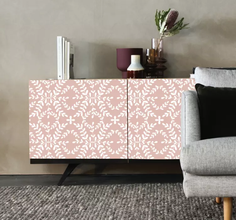 Designul grafic al Autocolantului decorativ cu motiv de frunze elaborate este o adevărată operă de artă, îmbinând nuanțe de roz cu frunze ornamentale într-un model floral elegant și modern, creând astfel o atmosferă abstractă și rafinată în orice încăpere.