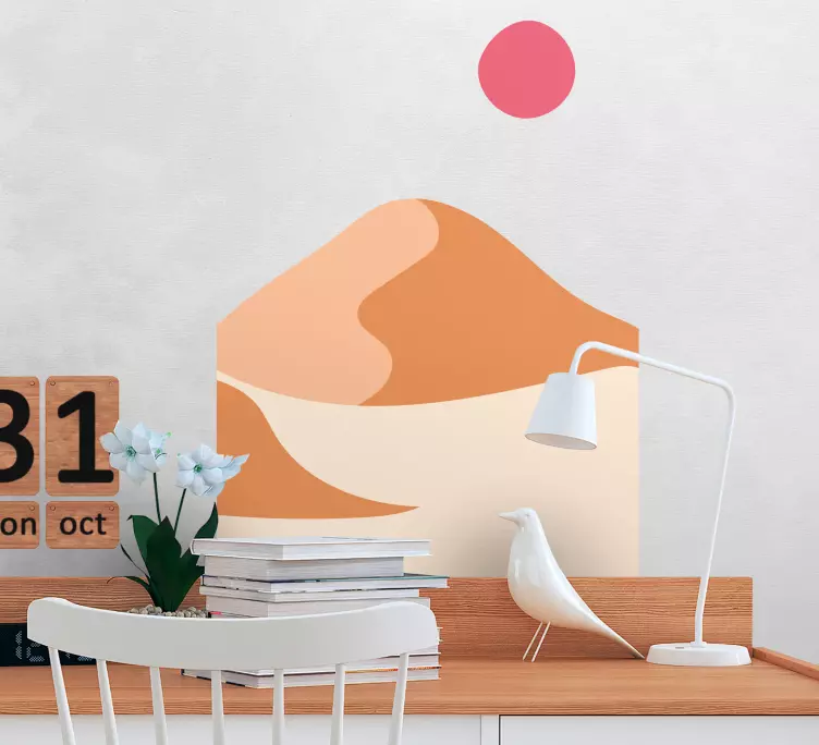 Designul grafic al autocolantului decorativ dune de nisip abstracte este o evocare a frumuseții naturii, combinând în mod armonios imaginea munților cu ilustrații abstracte, soarele strălucitor, nisipul fin și dunele elegante, totul într-un stil minimalist care transformă orice spațiu într-un refugiu de relaxare.