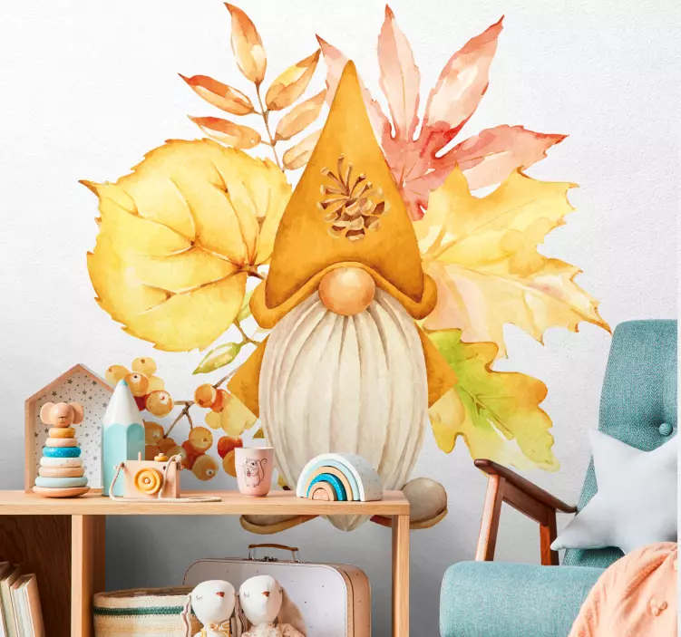 Descoperiți magia toamnei cu autocolantul decorativ figură de gnom de toamnă care îmbină elemente de natură, acuarelă și un design rafinat, perfect pentru a aduce un strop de căldură și culoare în orice colț al casei dumneavoastră. Acest decor inspirat din sezonul autumnal, cu frunze căzute și un gnom jucăuș, transformă atmosfera locuinței într-un refugiu primitor și plin de viață.