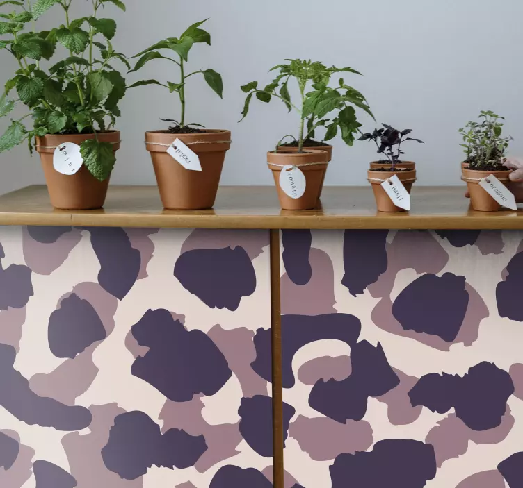 Descoperiți magia decorativă a Autocolantului decorativ imprimeu leopard, un produs care îmbină perfect camuflajul cu nuanțele de violet într-un design modern și stilat inspirat de natură, ideal pentru a transforma orice mobilă într-un element de atracție abstract.