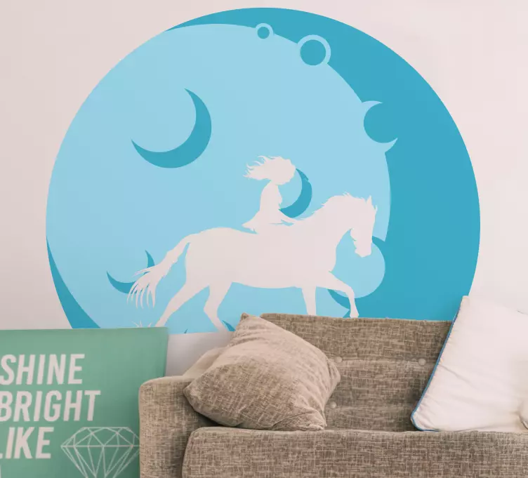 Descoperiți autocolantul fată călărind calul, o alegere perfectă pentru a aduce un strop de magie în decorul oricărei încăperi! Designul grafic îmbină armonios imaginea unei fete călărind un cal sub lumina blândă a unei luni strălucitoare, într-o paletă de culori albastre ce evocă frumusețea naturii.