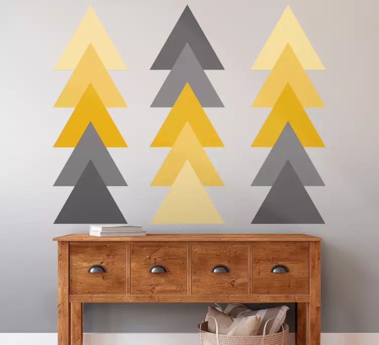 Designul grafic al acestui autocolant geometric aranjament cu motive triunghiulare este o combinație fascinantă de săgeți și triunghiuri ce se îmbină într-un model abstract și modern. Culorile galben și gri creează un contrast atrăgător, perfect pentru a adăuga un accent decorativ oricărei încăperi.