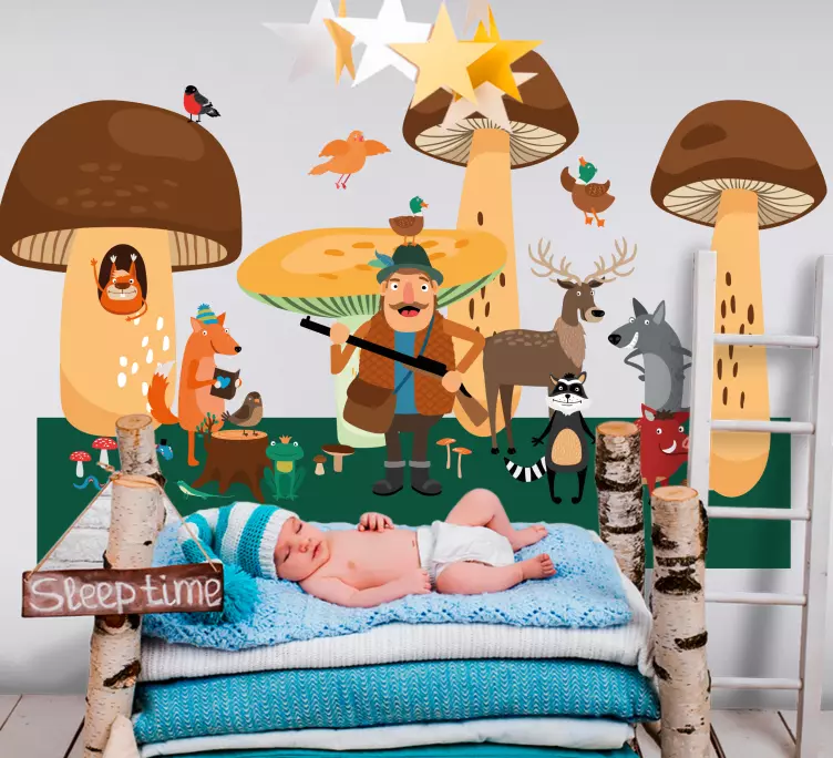 Bun venit în universul aventurii cu animale din pădure! Designul grafic al acestui autocolant pentru copii este o fantezie plină de ciuperci colorate, animale sălbatice și păduri verzi, perfect pentru a transforma camera copiilor într-un colț de natură capricios și plin de viață. Această ilustrare fermecătoare va face ca ora de culcare să devină o adevărată plăcere, oferind un decor inspirat din viața sălbatică ce va stimula imaginația celor mici.