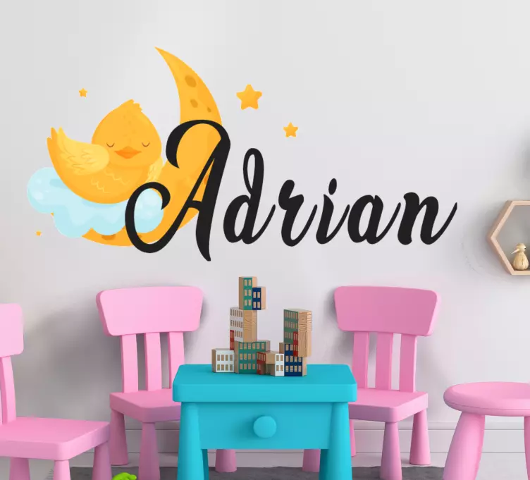 Descoperiți Autocolantul pentru copii design cu lună drăguță, un produs cu un design grafic inspirat care îmbină elemente jucăușe precum o gagică, o lună adorabilă și stele strălucitoare, toate acestea fiind personalizabile cu un nume special pentru micuțul dumneavoastră, aducând un aer de visare și confort în camera copiilor unde bebelușul va dormi liniștit printre nori.