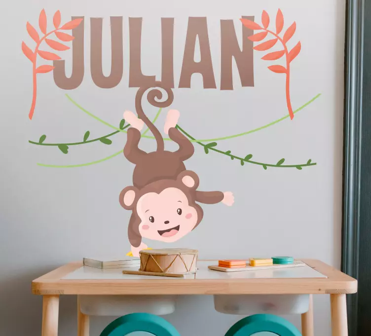 Referință: A49357Un design fermecător care prezintă o maimuță drăguță suspendată cu susul în jos de o viță. Designul include frunze vibrante și o opțiune pentru personalizare, făcându-l perfect pentru spațiile copiilor. Expresia jucăușă a maimuței adaugă o notă veselă oricărui mediu.