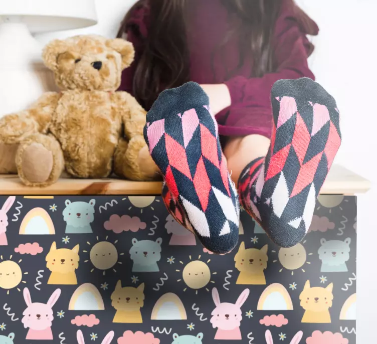 Designul grafic al Autocolantului pentru copii stiluri de creaturi adorabile este o explozie de culoare și imaginație, aducând la viață animale jucăușe, curcubee strălucitoare și personaje din desene animate care transformă orice cameră într-un spațiu distractiv și capricios. Acest produs este perfect pentru a înfrumuseța mobilierul și a adăuga un strop de veselie în viața copiilor!