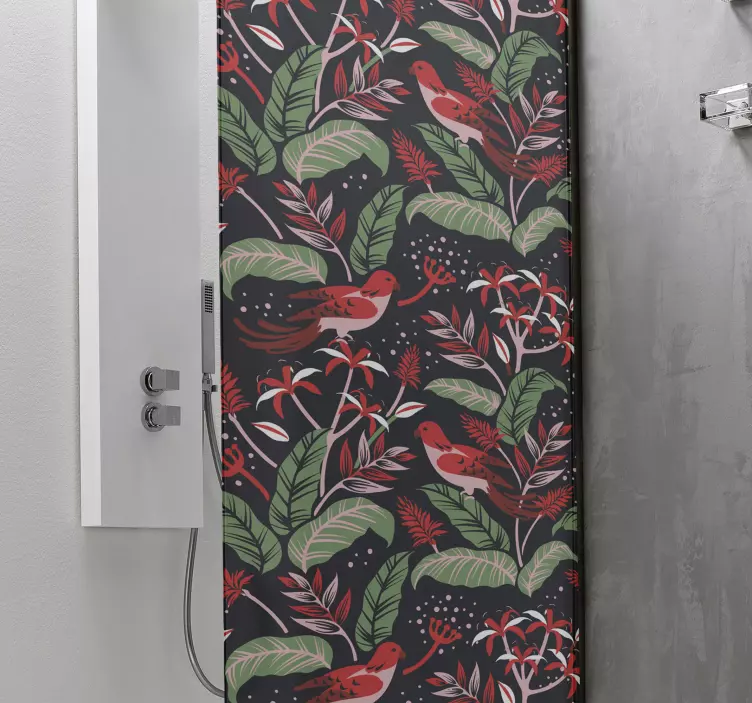 Designul grafic al Autocolantului pentru duș concept pasăre botanică este o adevărată capodoperă care îmbină elemente naturale vibrant cu un model floral fascinant, inclusiv frunze verzi și păsări roșii, creând o atmosferă de relaxare și prospețime în spațiul dumneavoastră.