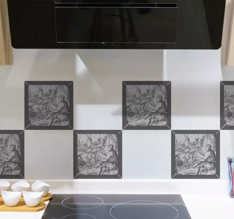 Descoperiți Autocolantul pentru faianță scene istorice, un produs deosebit care îmbină măiestria artistică cu un design grafic captivant. Acest autocolant, cu un model alb-negru, surprinde peisaje culturale și bărbați lucrând la mori, creând o atmosferă istorică deosebită în orice încăpere. Transformați-vă peretele într-o operă de artă unică, care aduce un strop de istorie și eleganță în casa dumneavoastră!