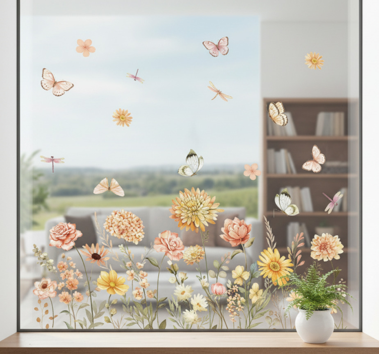 Autocolant pentru fereastră pajiște cu flori și fluturi