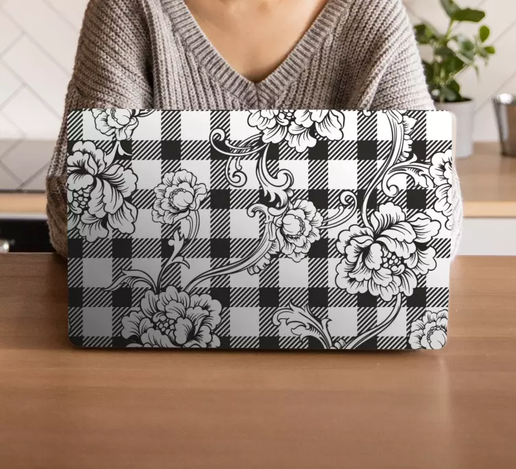 Descoperiți farmecul unic al autocolantului pentru laptop cu motiv floral în carouri, un produs ce îmbină cu eleganță un design grafic floral cu un model în carouri, aducând o textură alb-negru ce transformă laptopul într-un accesoriu stylish și personalizat.