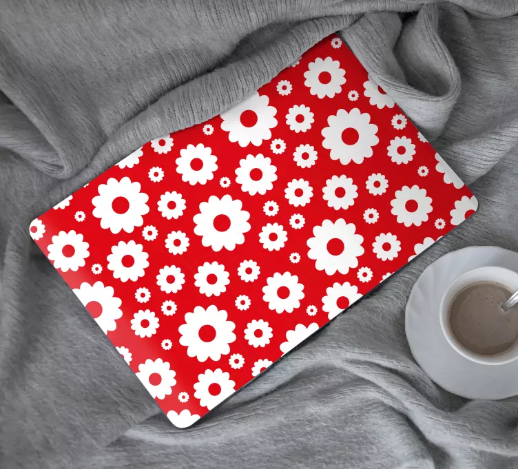 Descoperiți Autocolantul pentru laptop model flori puternice, un accesoriu deosebit ce îmbină un design grafic vibrant cu margarete albe pe un fundal roșu, aducând o notă jucăușă și plină de viață laptopului dumneavoastră. Acest model floral este perfect pentru cei care doresc să-și personalizeze dispozitivele cu un aer proaspăt și colorat!
