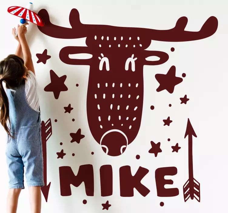 Descoperiți magia decorativă a autocolantului personalizabil față de cerb jucăuș, un design grafic încântător care îmbină elemente nordice cu un cerb jucăuș, stele strălucitoare și săgeți pline de viață, toate personalizabile cu numele copilului dumneavoastră. Acest produs aduce un strop de veselie și creativitate în orice cameră, transformând-o într-un loc de joacă și imaginație!