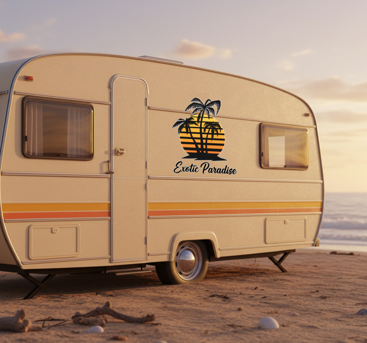 Fiecare aventură merită să fie însoțită de un decor inspirat! Autocolant rulotă autocolant rulotă apus exotic în paradis nu doar că aduce un strop de frumusețe, dar și personalitate rulotei dumneavoastră. Imaginați-vă cum atrage privirile peisajul vostru de camping, transformându-l într-un loc de vis! Alegeți să transformați fiecare călătorie într-o experiență memorabilă!