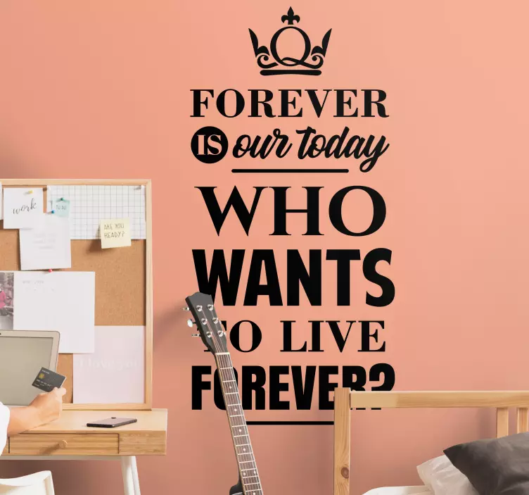 Descoperiți Autocolantul text cine vrea să trăiască veșnic, un produs cu un design grafic captivant care îmbină armonios muzica cu inspirația versurilor. Acest autocolant monocrom aduce o notă de eleganță și profunzime în orice spațiu, transformându-l într-un loc de reflecție și creativitate. Cu un mesaj puternic despre a trăi pentru totdeauna, acest text devine un adevărat citat de inspirație ce va încânta privitorii.