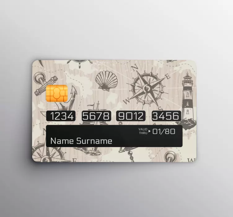 Designul grafic al autocolantelor de carduri de credit cu temă maritimă este o adevărată capodoperă artistică, care îmbină elemente nautice cu o estetică elegantă. Fiecare detaliu, de la ancore și hărți până la faruri și busole, este realizat cu măiestrie, aducând un strop de atmosferă marină în orice spațiu. Ilustrațiile de pe acest autocolant evocă senzația de aventură pe mare, în timp ce textura de lemn și coajă completează perfect acest peisaj. Este mai mult decât un simplu decor; este o invitație la explorare!