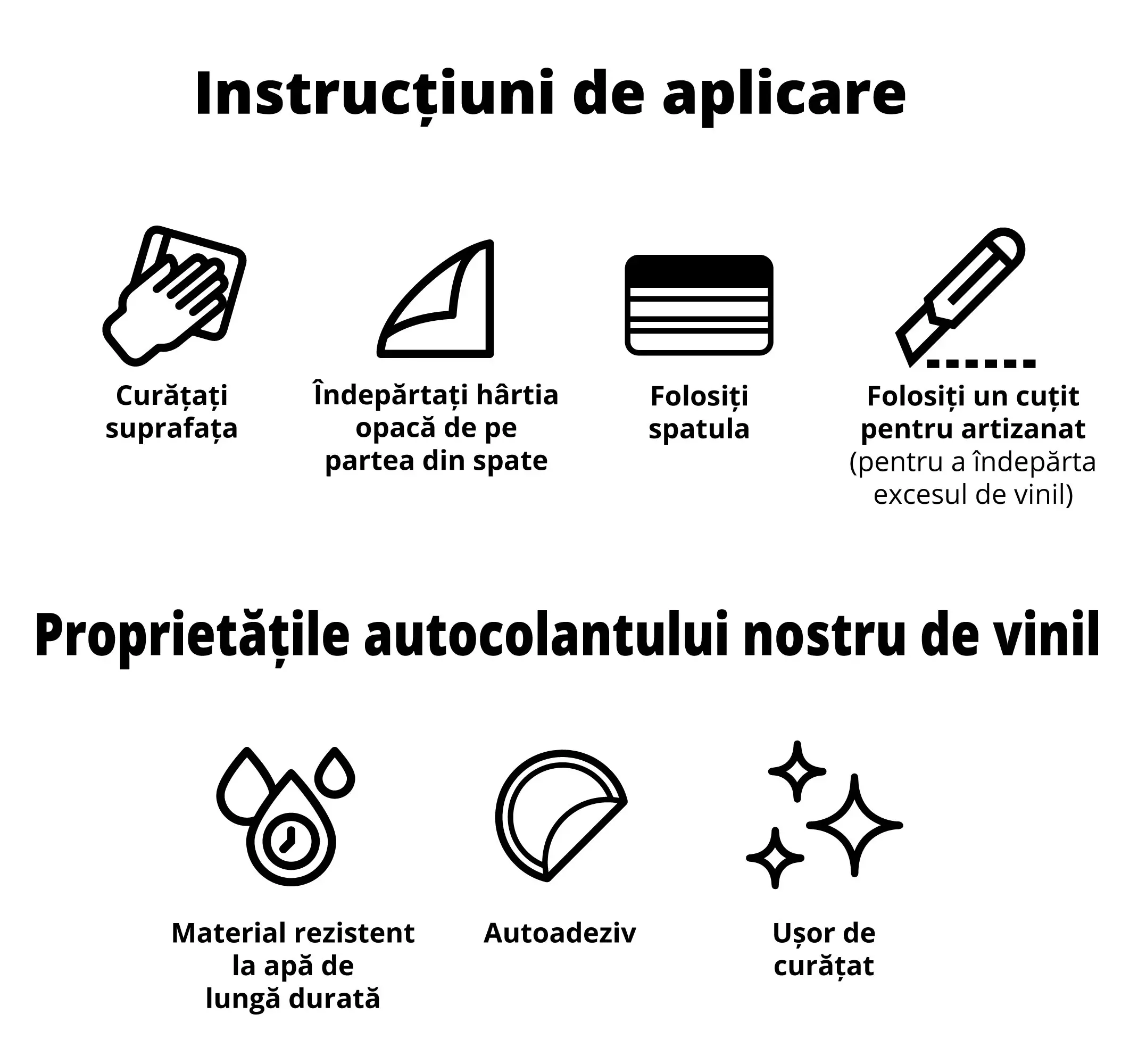 NOTĂ: Dacă autocolantul dvs. are hârtie de transfer, este recomandabil să nu o îndepărtați până când nu a trecut timpul de uscare de 12/24 de ore.