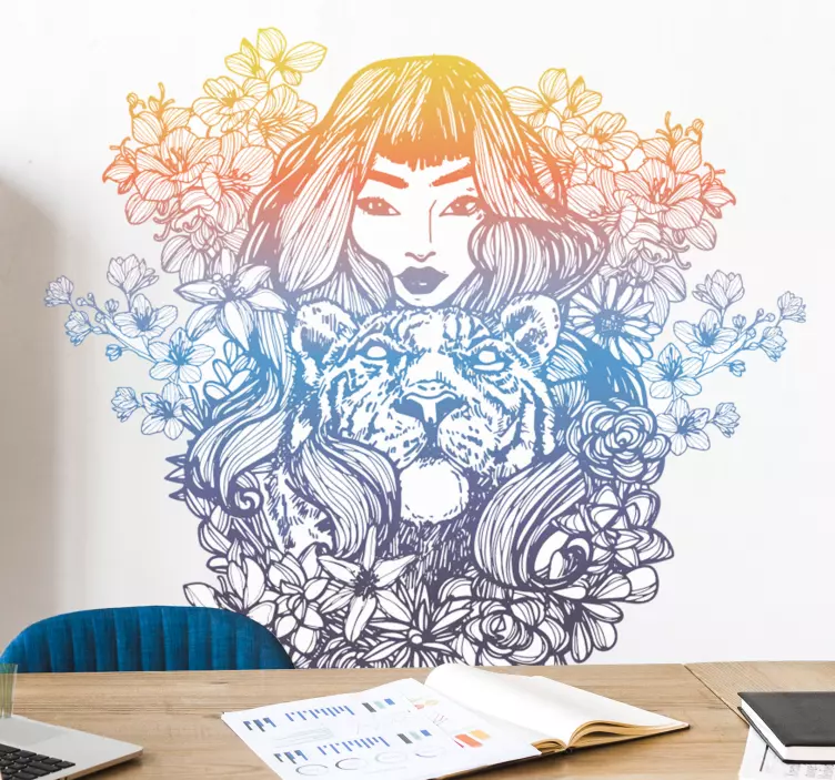 Designul grafic al Etichetelor animale femeie cu tigru este o adevărată operă de artă, combinând elemente celtice cu imaginea puternică a unei femei însoțită de un tigru, iar florile și motivele florale se împletesc armonios cu un gradient vibrant, creând o linie de artă captivantă cu culori îndrăznețe.