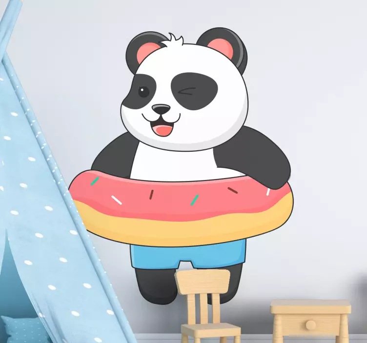 Referință: A46909Un personaj jucăuș de panda este reprezentat savurând un donut, emanând o vibrație veselă. Designul fermecător prezintă culori vii și o expresie umoristică, fiind perfect pentru spațiile destinate copiilor. Acest design evocă sentimente de bucurie și distracție, ideal pentru a crea o atmosferă plină de viață.