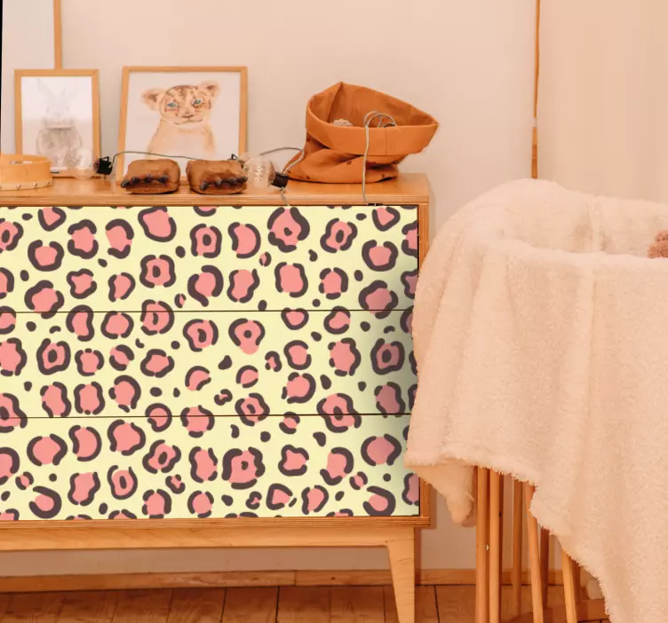 Designul grafic al etichetei animale textură blană leopard este o explozie de stil și eleganță, combinând motivele de leopard cu petele roz într-un model sofisticat, perfect pentru a adăuga un strop de personalitate mobilierului dumneavoastră.