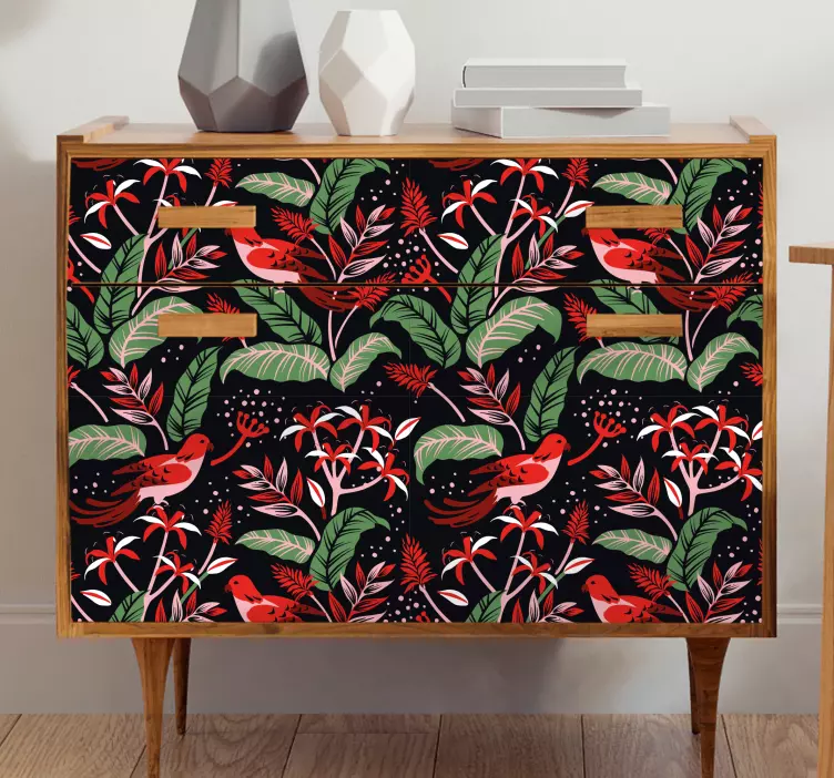 Bucurați-vă de un design grafic vibrant și plin de viață cu Flori și plante autocolante concept floral tropical, care îmbină nuanțe colorate de roșu și verde pentru a aduce natura mai aproape de dumneavoastră. Cu un model captivant ce include frunze și păsări, acest produs este perfect pentru a transforma orice spațiu, de la mobilier la pereți, într-un colțișor tropical de vis!