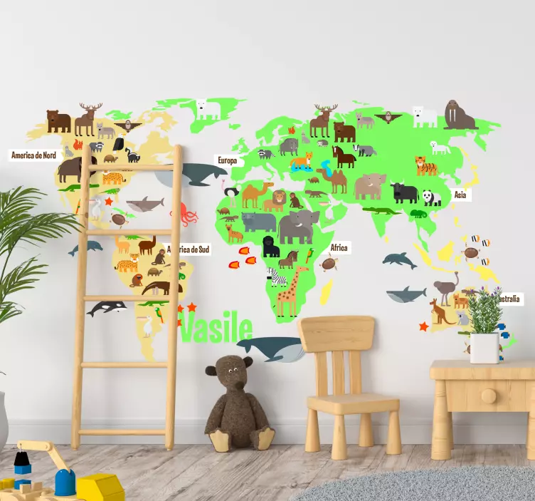 Această harta lumii autocolantă de perete este perfectă pentru copii, deoarece le va permite să exploreze și să învețe despre animalele din întreaga lume. Copiii vor fi încântați să descopere cât mai multe informații despre aceste animale fascinante.