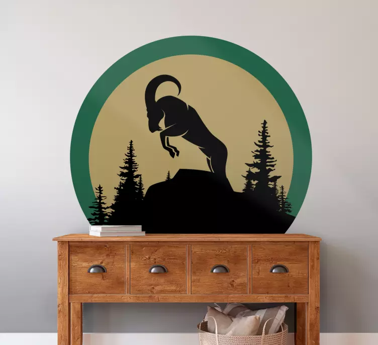 Descoperiți frumusețea naturii prin intermediul stickere locuri contur capră montană, care îmbină armonios un design grafic circular ce surprinde un munte măreț, copaci viguroși, o capră sălbatică în salt, toate acestea într-o siluetă elegantă ce evocă viața sălbatică din pădure.