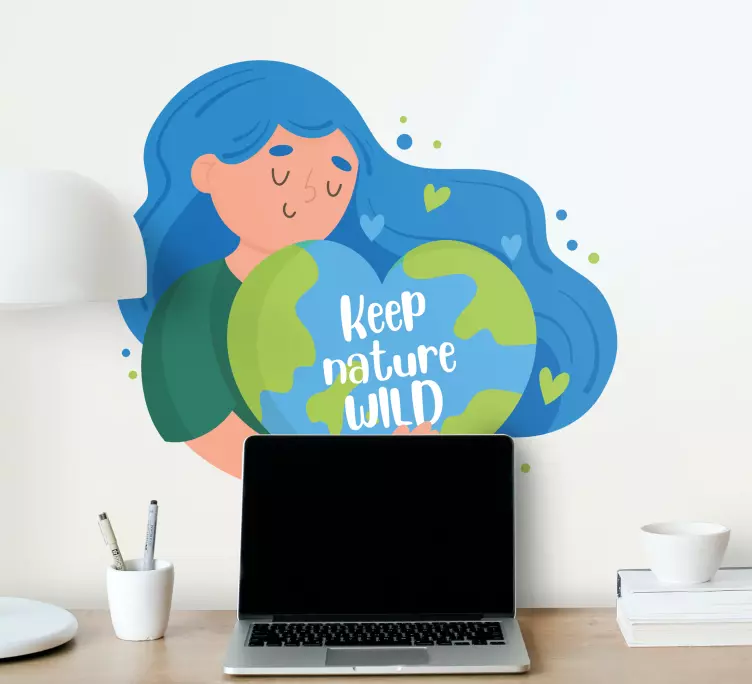 Referință: A48040O reprezentare care subliniază importanța grijii față de planeta noastră, înfățișată printr-un personaj care ține cu blândețe un glob în formă de inimă. Fraza încurajează un angajament de a păstra aspectele sălbatice ale naturii, punând accent pe dragoste și conexiune cu pământul.