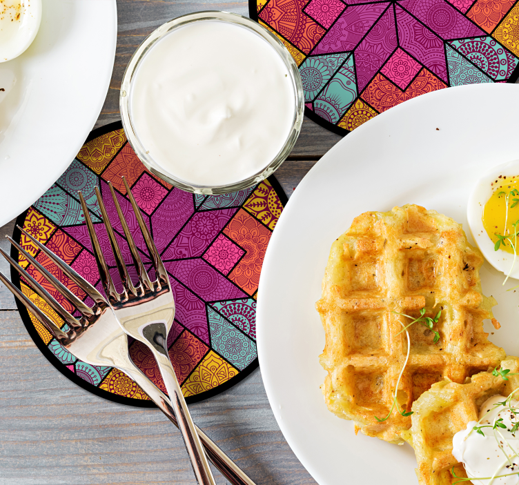 Suporturi pahare aranjament geometric vibrant aduc un strop de energie și culoare în orice spațiu. Designul grafic îmbină armonios elemente paisley, mozaic, forme florale și un model vibrant, colorat, geometric, decorativ, împodobit cu flori care simbolizează înflorirea. Acest suport nu doar că protejează suprafețele, dar devine și un punct de atracție în decorul casei tale!