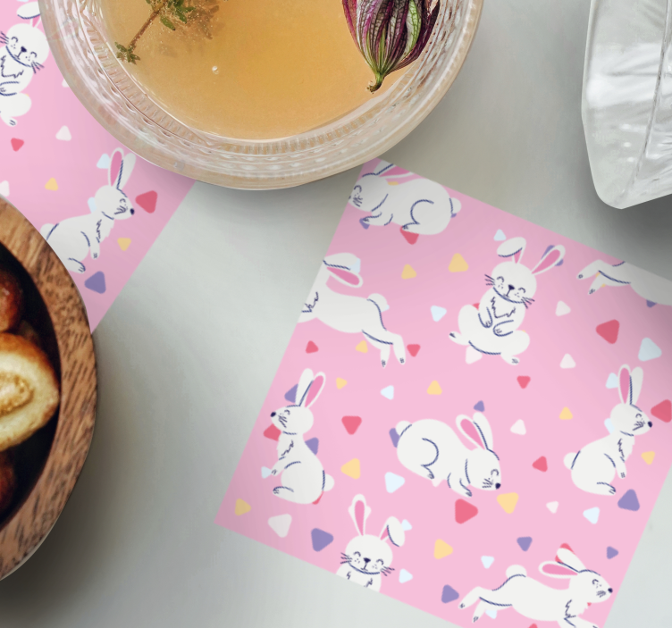 Descoperiți magia designului grafic cu suporturi pahare cu nume modele jucăușe cu iepurași, care îmbină forme geometrice jucăușe precum triunghiurile roz și iepurașii colorați într-un mod drăguț și vesel. Fiecare detaliu este gândit pentru a adăuga un strop de bucurie oricărui decor, transformându-l într-un spațiu plin de viață!