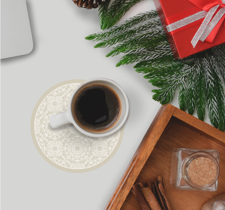 Designul grafic al suporturilor pahare cu suprafață rotundă cu model complex se remarcă prin nuanțe de bej, ornamente delicate și un model ornamental inspirat din mandala clasică, creând o atmosferă elegantă și sofisticată. Această piesă decorativă, cu un aspect texturat și circular, este împodobită cu tonuri neutre și o simetrie perfectă, aducând un strop de rafinament în orice încăpere.