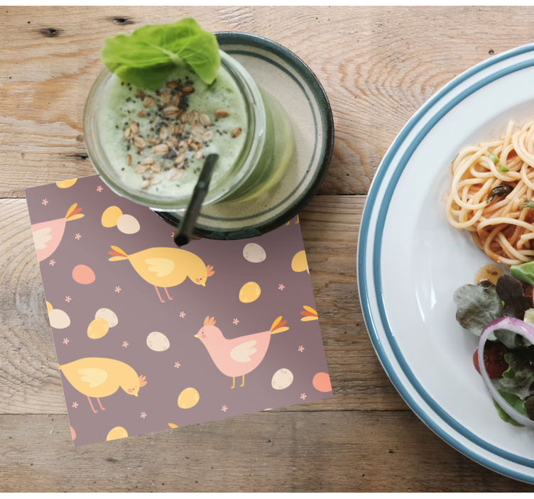 Designul grafic al suporturilor pahare de nuntă cu model păsări fermecătoare este plin de farmec, aducând împreună imaginea jucăușă a puilor și găinilor, alături de ouăle acestora și a agricultorului care îngrijesc animalele. Culorile pastel se îmbină perfect în acest design drăguț și capricios, transformând fiecare masă într-un loc de poveste!