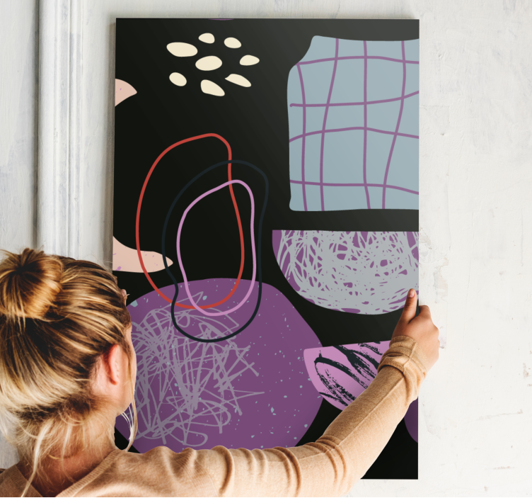 Acest tablou ornamental cu trăsături botanice abstracte impresionează printr-un design grafic inovator, îmbinând forme geometrice și un colaj vibrant de nuanțe de violet, rezultând o piesă modernă care transformă orice spațiu. Arta florală se împletește cu un stil abstract, creând o atmosferă unică și captivantă.